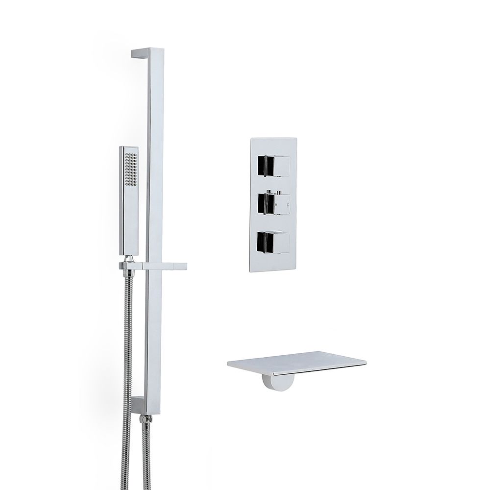Conjunto de Ducha con Mezclador de Ducha Termostático Cuadrado Triple Cromado de 2 Salidas con Llenador de Bañera con Caída Efecto a Cascada y Kit de Barra Deslizante- Kubix