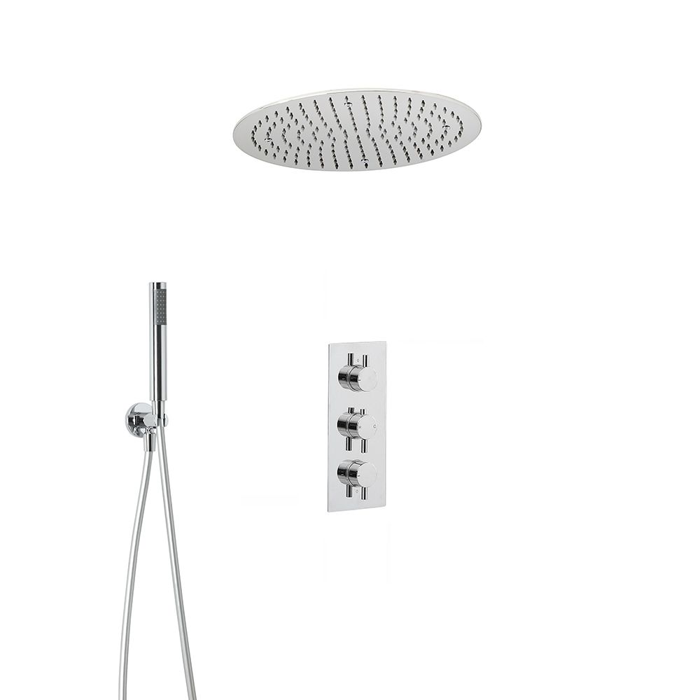 Agregue un toque de lujo a su cuarto de baño con este elegante conjunto de ducha con mezclador de ducha termostático redondo triple de 2 funciones, completo con alcachofa de ducha de 400mm y ducha de mano. El conjunto es perfecto para asegurar calidad, durabilidad y elegancia.
