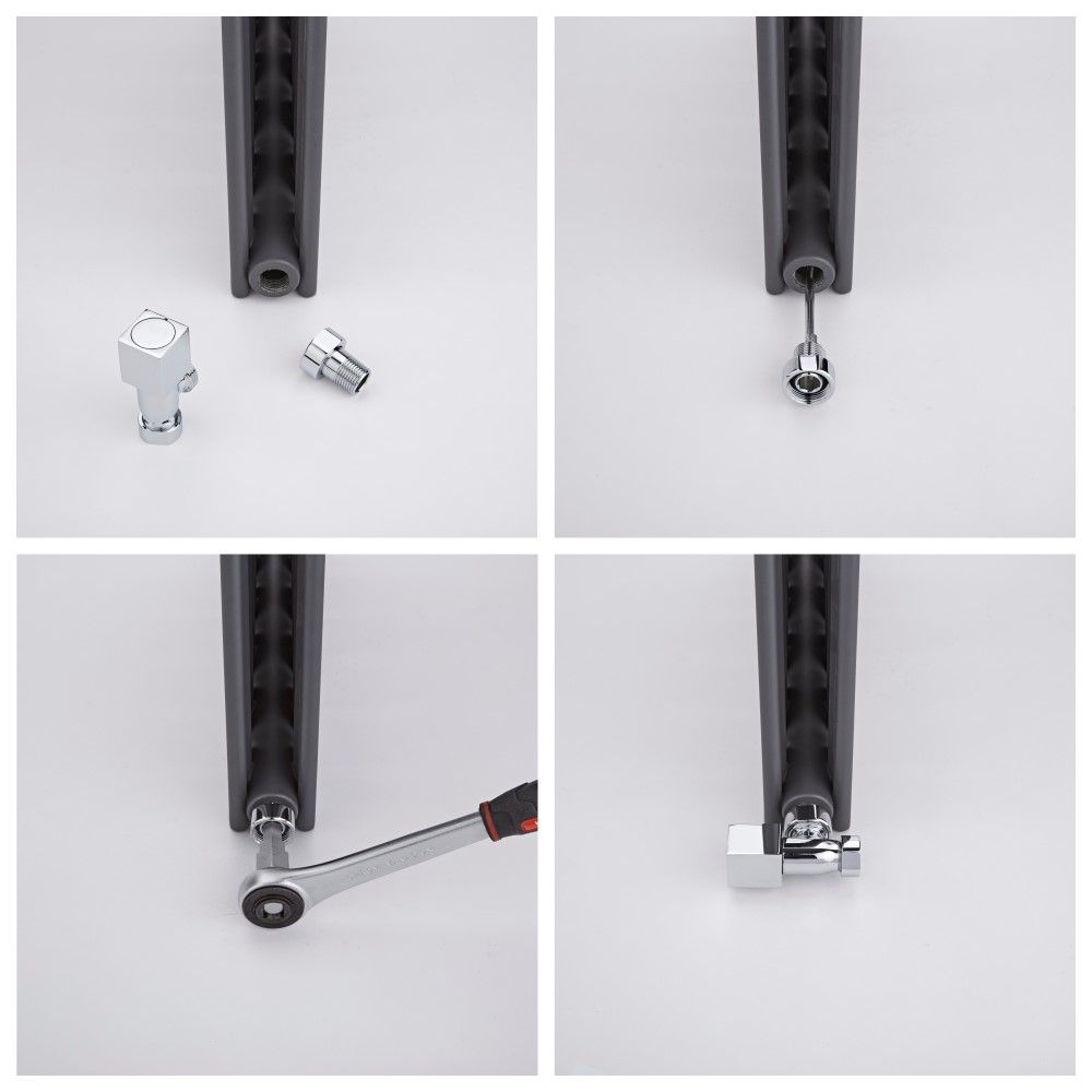 N.B: No es compatible con la gama e radiadores con columnas tradicionales Windsor, con modelos tradicionales como la gama Revive Caldae o con colonas superiores a 36mm. Este producto únicamente es compatible con radiadores que tenga una entrada con racor a rosca de 3/4"