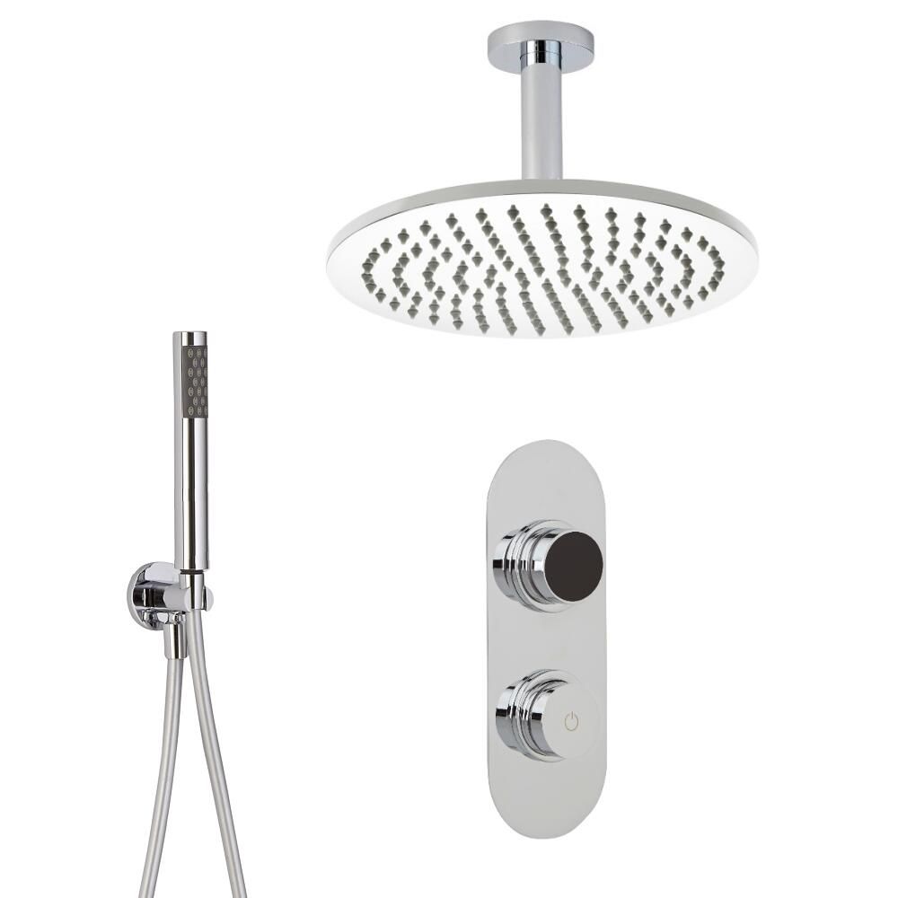 Controle su ducha de manera sencilla con este sistema de ducha digital de 2 salidas. Este conjunto incluye una alcachofa de ducha redonda de 300mm, un brazo de ducha de techo y un telefonillo de ducha con flexo y codo. Caracteriza un elegante diseño minimalista con un acabado cromado, este termostato digital de dos funciones le permite desviar el paso del agua y controlar la temperatura de manera extremadamente simple e incluye un indicador que cambia de color conforme varíe la temperatura. Requiere una zona empotrable para completar la instalación del controlador en la pared o techo.