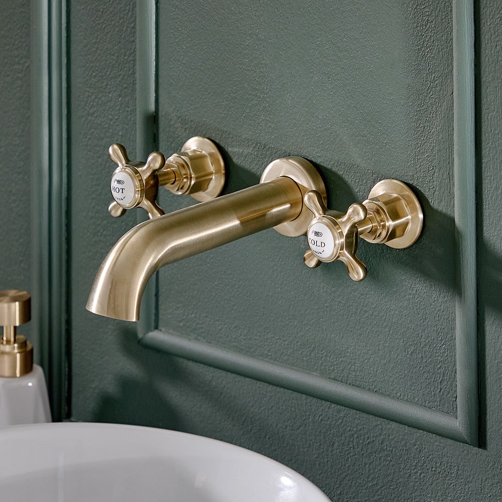 Grifo Mezclador Mural para Lavabo de 3 Agujeros Tradicional con Manijas en Cruceta - Oro Satinado - Elizabeth