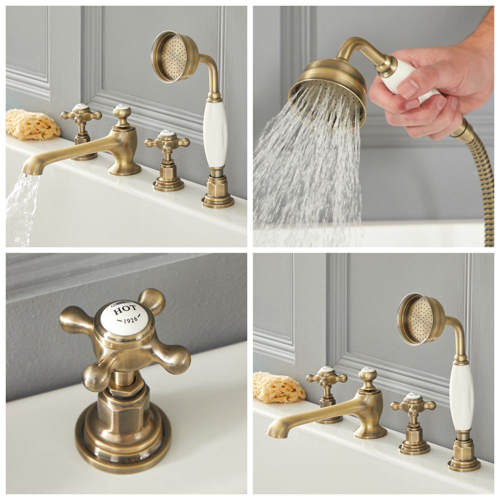 Un elegante grifo mezclador para bañera de 4 agujeros con acabado efecto oro cepillado que ha sido diseñado para asegurar agregar clase y crear un look retro en cualquier cuarto de baño. Este modelo caracteriza un elegante diseño de 4 agujeros con manijas en cruceta, un telefonillo y un flexo de ducha que le proporciona con un elemento elegante y práctico a la vez. Este modelo es compatible con bañeras que dispongan de 4 agujeros para la grifería.