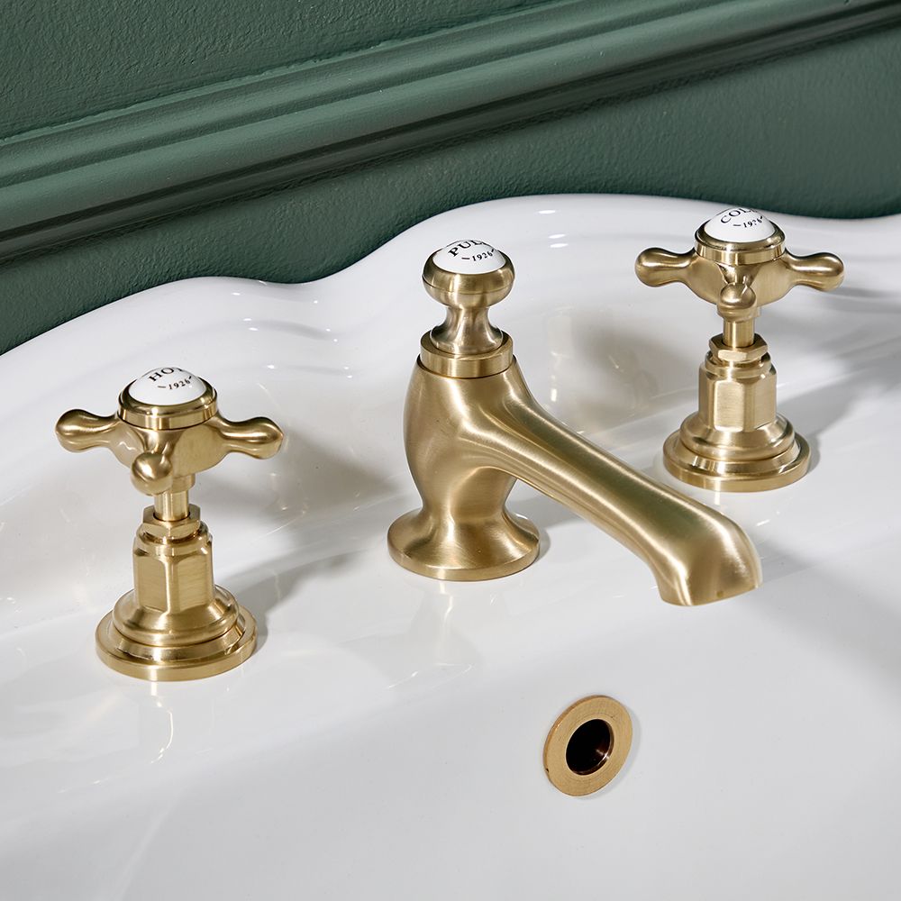 Este modelo caracteriza un elegante diseño de 3 agujeros con manijas en cruceta y un elegante acabado de color oro satinado y cuenta con pomos de cerámica con detalles muy bellos, para crear un look atemporal. Incluye una varilla posicionada en la parte trasera del grifo para permitirle controlar la válvula de desagüe.