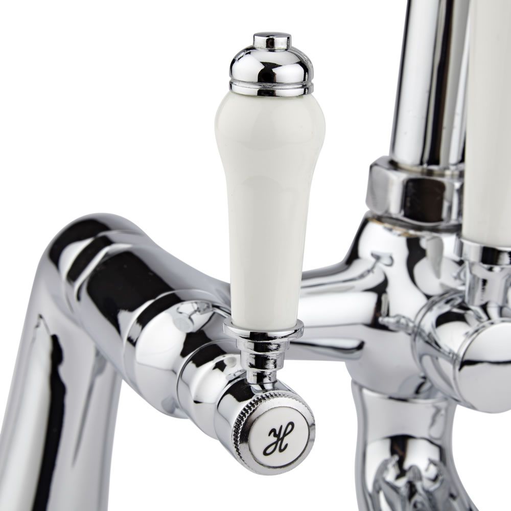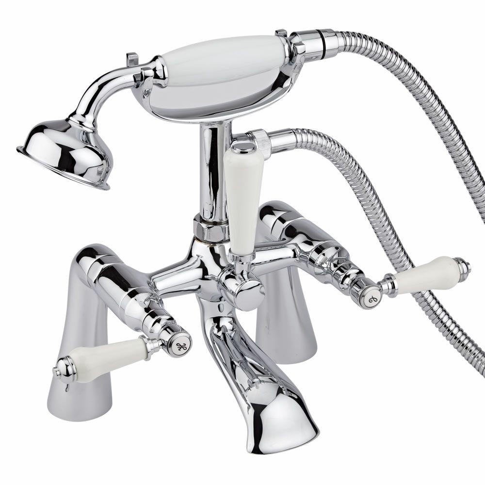 Un conjunto de bañera tradicional completo con mezclador de bañera tradicional con ducha de mano y flexo de ducha con pomos de color blanco.