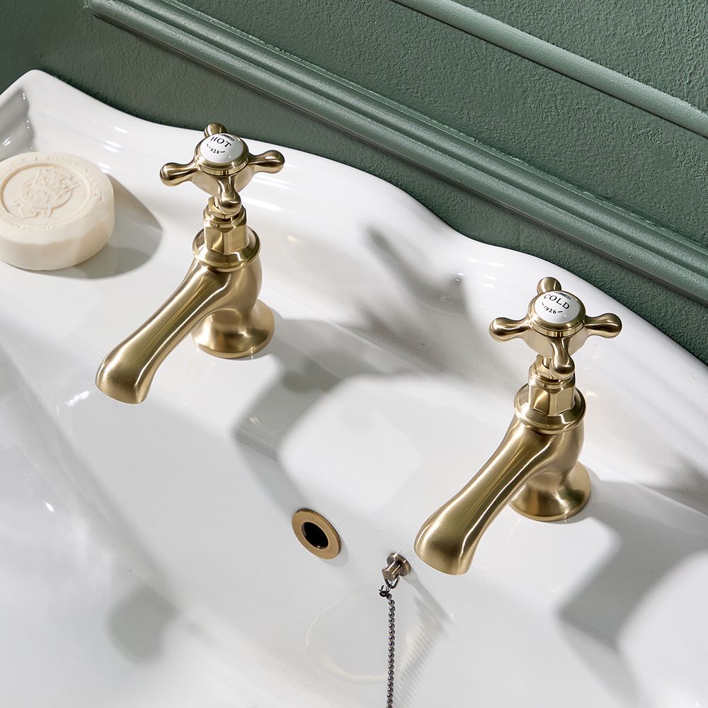 Esta grifería de lavabo en estilo tradicional de la gama Elizabeth, ha sido diseñada para crear un look clásico en su cuarto de baño. Este modelo caracteriza un elegante acabado con efecto oro satinado y es compatible con cualquier lavabo de 2 agujeros. Estos dos grifos individuales de agua fría y agua caliente cuentan con pomos de cerámica con detalles muy bellos y han sido realizado de latón sólido para garantizar ofrecer calidad, elegancia y durabilidad al mismo tiempo.