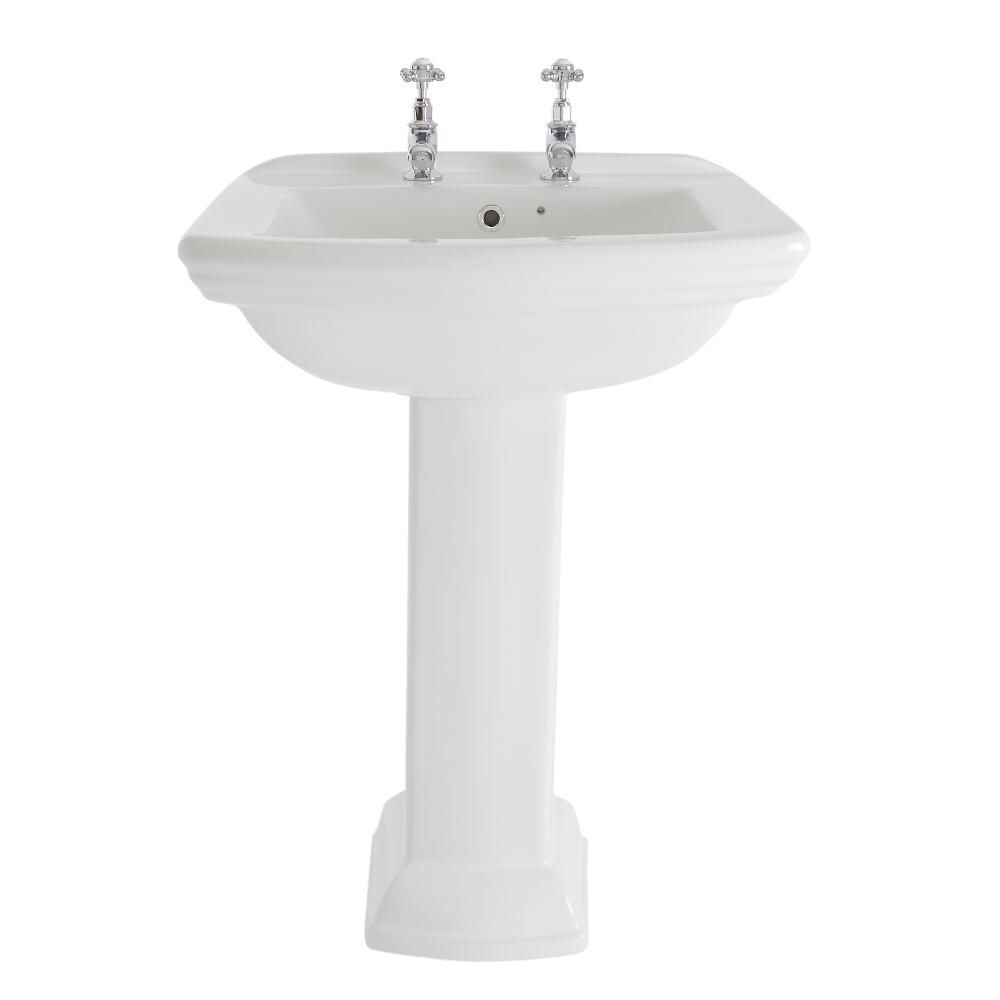 Lavabo de 2 Agujeros con Pedestal de Cerámica Blanca Tradicional con Diseño Cuadrado - Chester