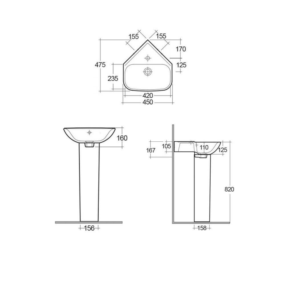 Lavabo de Esquina Moderno Blanco Lúcido Completo con Pedestal - 450mm (1 Agujero para la Grifería) - RAK Origin x Hudson Reed