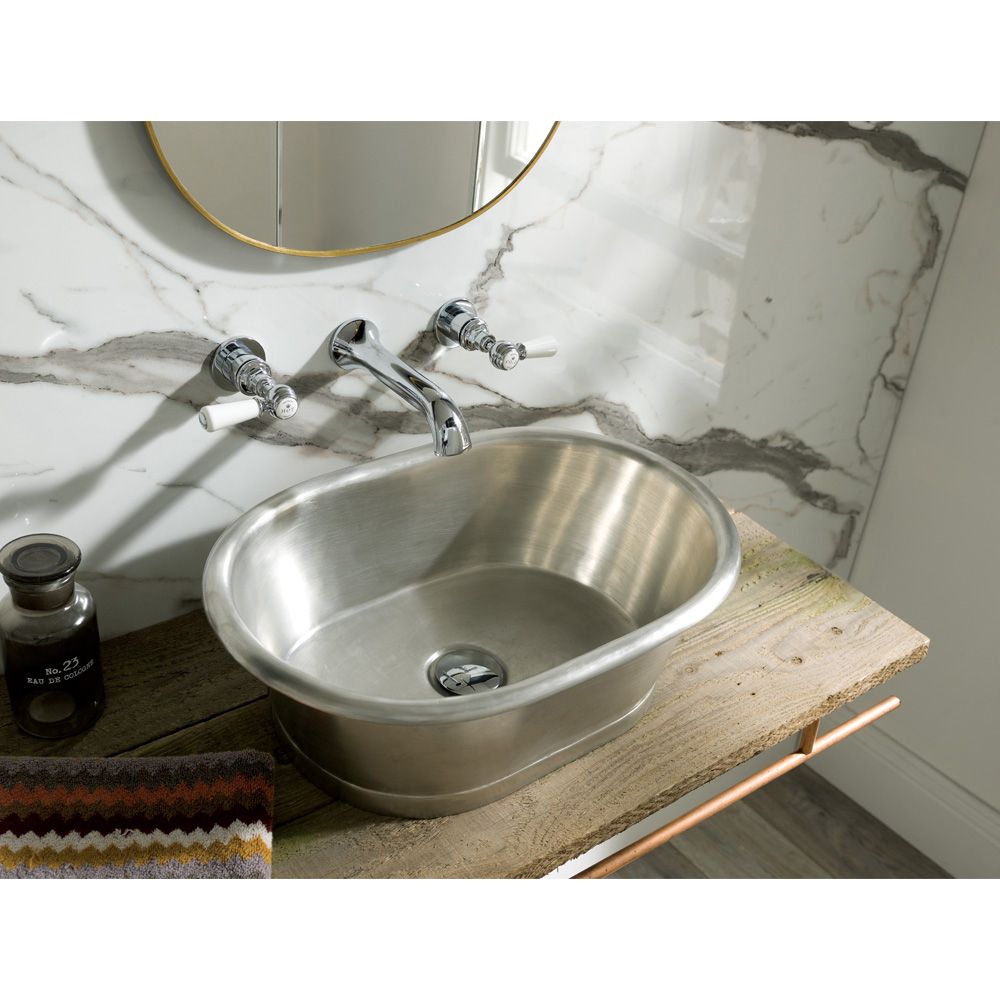 Este elegante lavabo se caracteriza por su hermoso acabado en peltre.