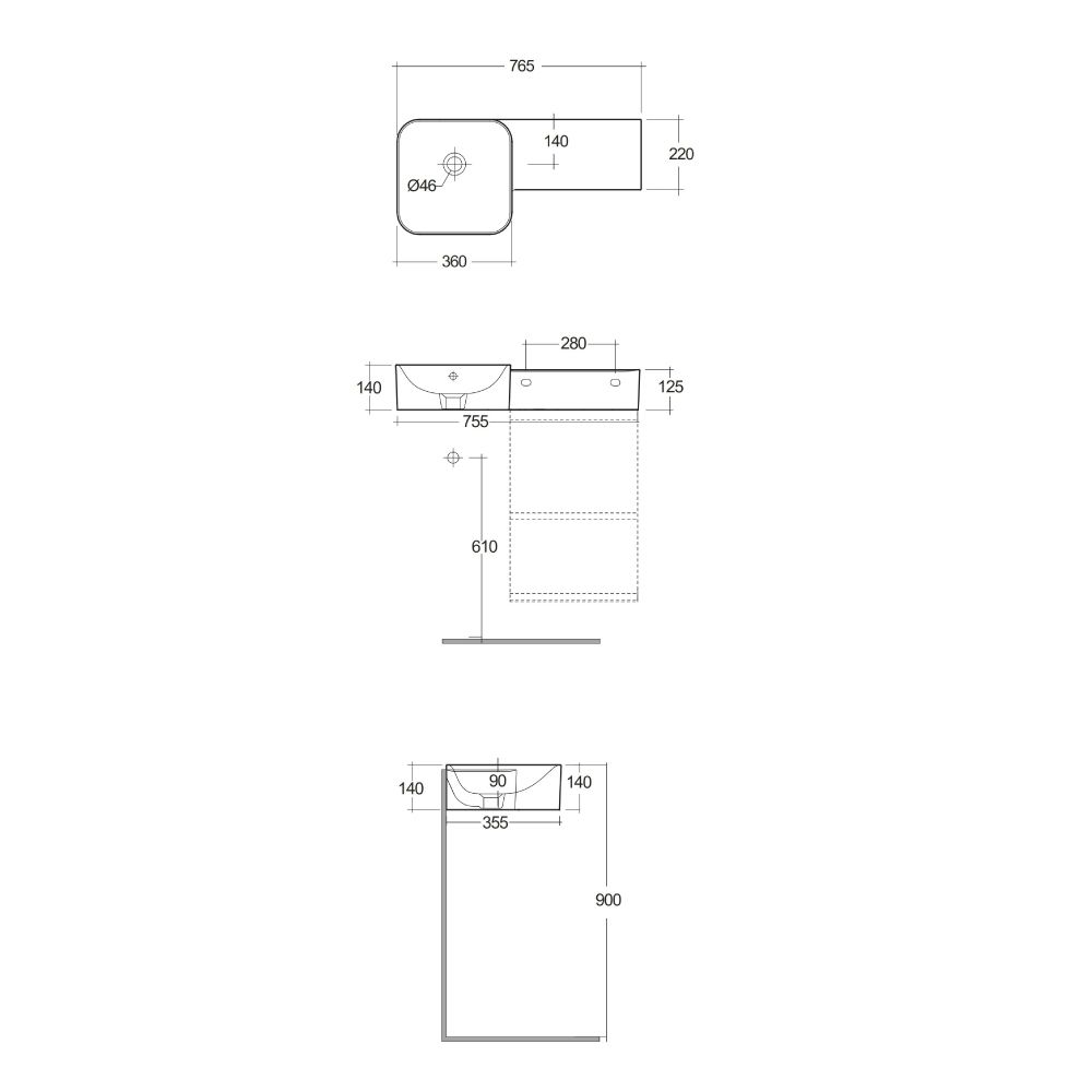- Dimensiones: ancho 765mm x prof. 360mm x alto 140mm