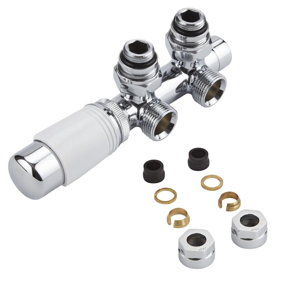 Llaves Angulares Cromadas para Radiador y Radiador Toallero con Conexión Central Completas con Cabezal Termostático Cromado y Blanco y Adaptadores para Tubos de Cobre 15mm - Multiblock H