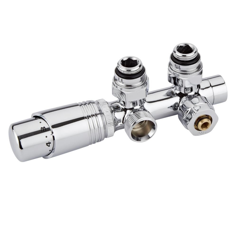 Llaves Angulares Cromadas para Radiador y Toallero con Cabezal Termostático Cromado y Adaptadores para Tubos Pex o Multicapa de 16mm - Multiblock H
