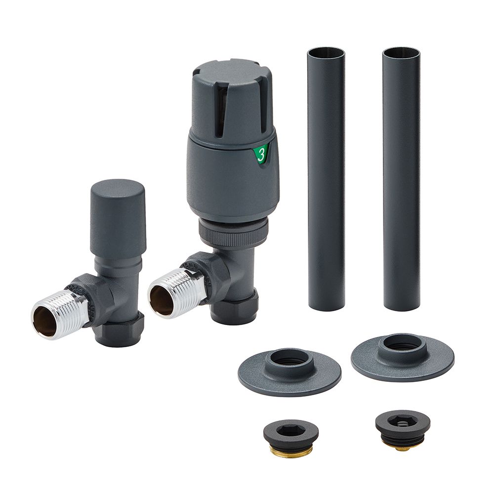 Llaves para Radiador Modernas Termostáticas Angulares y Kit Cubre Tubos - Disponible en Distintos Acabados
