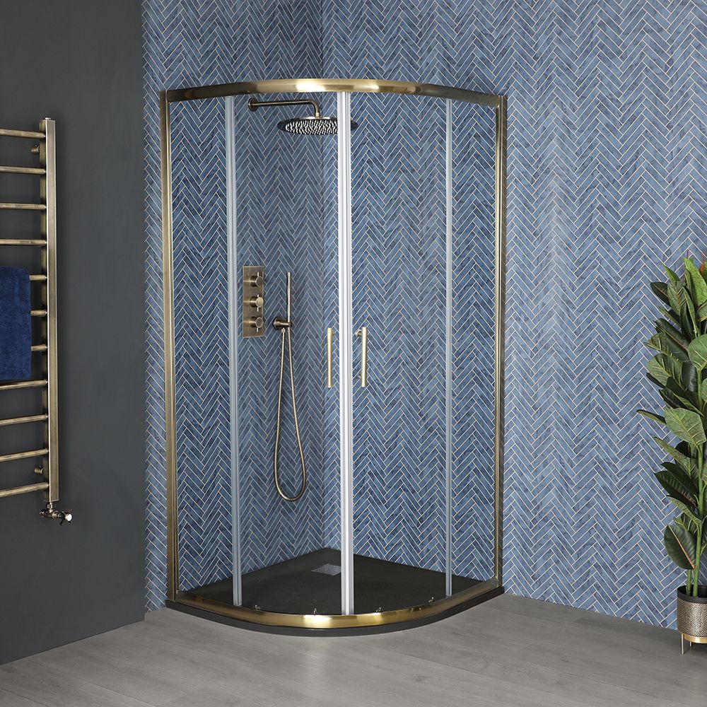 Maximice su espacio y cree un verdadero punto de impacto visual en su baño con esta mampara de ducha angular Alama de 900mm con efecto latón antiguo, que viene completa con plato de ducha con efecto pizarra y válvula de desagüe de vaciado rápido.