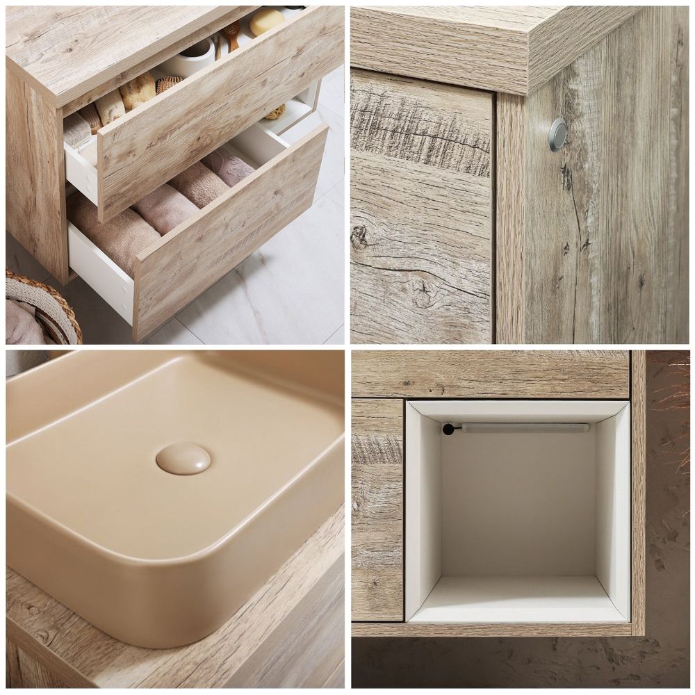 Con el mueble de baño Hoxton puede optar entre una selección de acabados y puede agregar una luz LED para muebles para iluminar la repisa abierta - simplemente haga su selección de las opciones disponibles del menú.