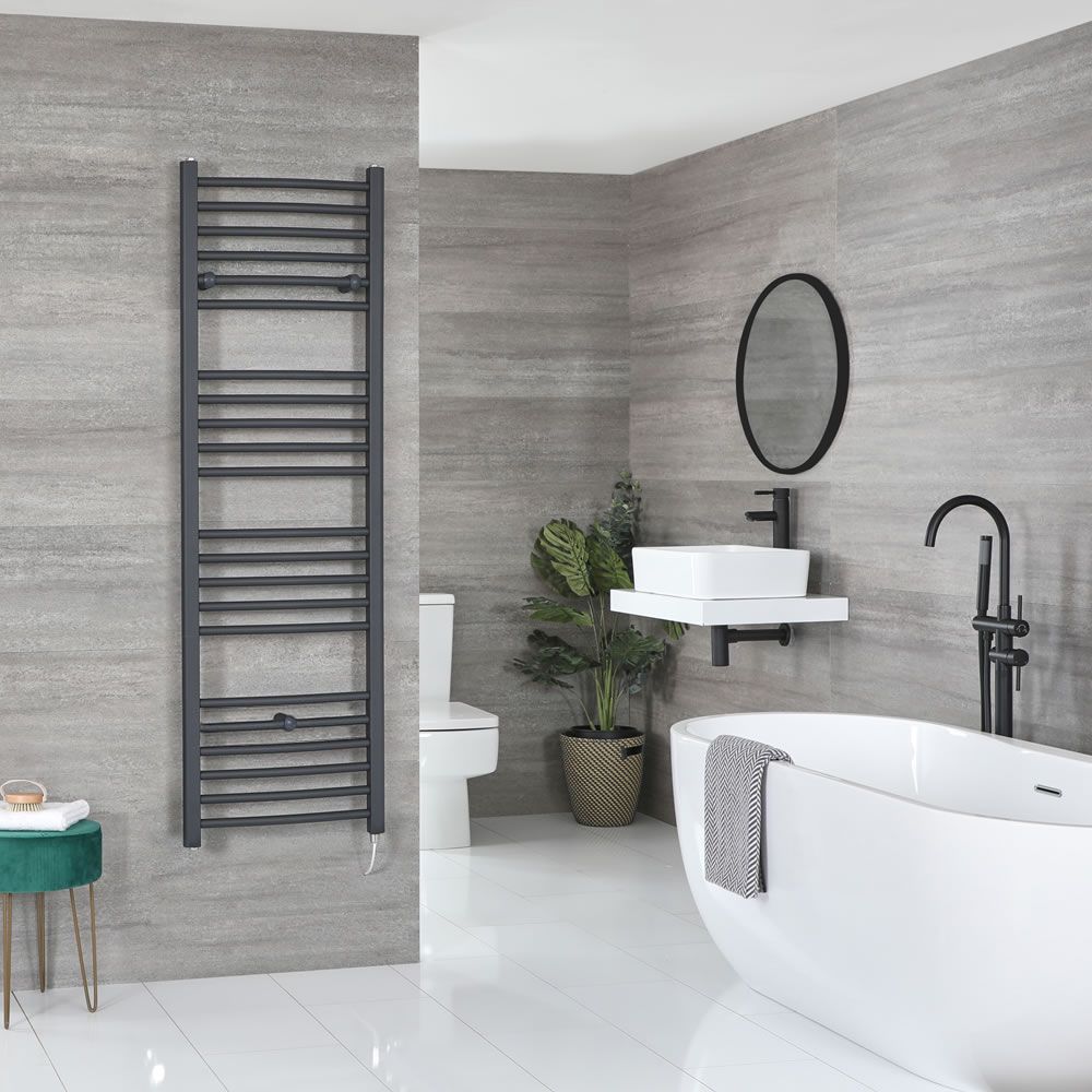 Cree un verdadero impacto visual en su cuarto de baño y cree un ambiente acogedor al mismo tiempo gracias a este elegante radiador toallero eléctrico de color antracita de 1600mm x 500mm de la gama Artle que viene completo con un elemento eléctrico de 800 vatios y grado de protección IP67.