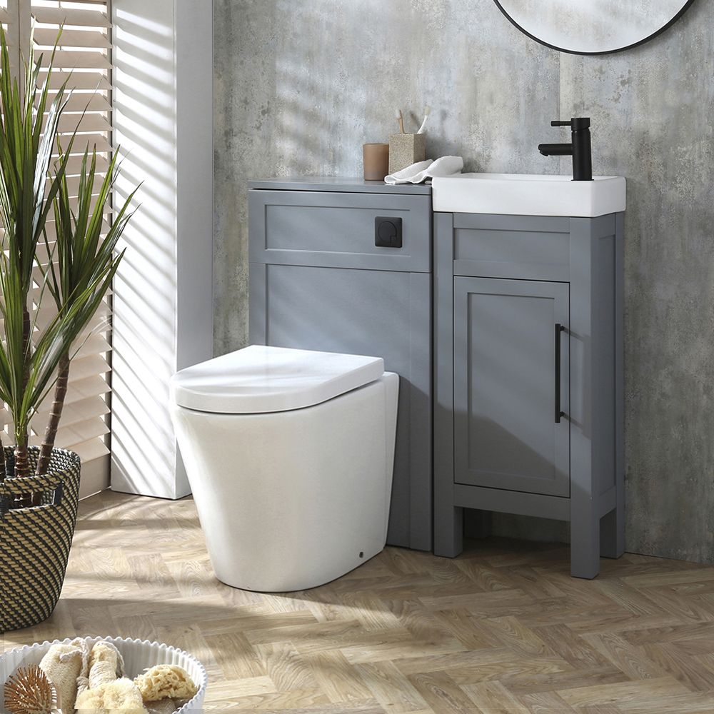 Agregue un toque de clase atemporal a su cuarto de baño con este conjunto de muebles de baño de color gris claro de la colección Warwick de color gris claro que viene completo con un mueble para lavabo a suelo compacto de 400mm y un mueble para wc con inodoro adosado y cisterna de doble descarga para ayudarle a ahorrar agua.