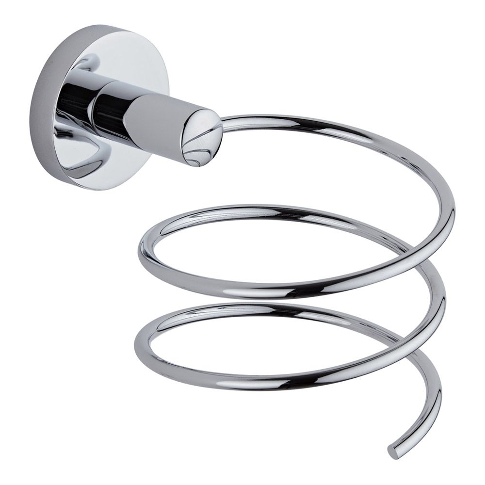 Un soporte de pared en espiral moderno con acabado en cromo diseñado para tener a mano el secador de pelo. El soporte en espiral es ideal para cualquier cuarto de baño moderno gracias a su diseño minimalista con acabado en cromo.