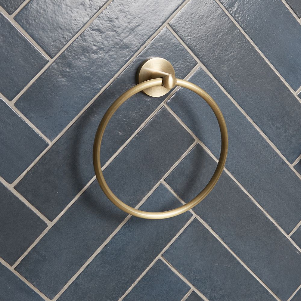 Acentúe el estilo moderno de su baño y agregue esos elegantes toques finales con toallero de pared en aro en acabado latón cepillado de la gama Alama.